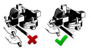 3. هرگز از يك اهرم مجزا براي فشار آوردن به دسته ميل پيچ گيره روميزي بمنظور محكم بسته شدن قطعه كار درون فك ها، استفاده نكنيد.